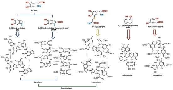 Eumelanin, deriving from the oxidative polymerization of L-DOPA (L-3,4-dihydroxyphenylphenylalanine), itself a product of tyrosine metabolic pathway, is brownish-black and it is mostly present in animals, in mammalian skin, eyes, and hair [23,24,31,32]. Pheomelanin, whose key structural unit is cysteinyl-DOPA, is instead characterized by a yellow-reddish-brown color, typical of red hair and freckles [23,24]. It differs from eumelanin due to the presence of sulfur-containing units (i.e., benzothiazines and benzothiazoles) [24,29]; its biosynthesis indeed starts from the polymerization of 5-S-cysteinyl-dopa, itself deriving from dopaquinone in the presence of cysteine [24,28,30]. Neuromelanin contains both pheomelanin and eumelanin, and, as the name suggests, this pigment is found in the brain, but its function is still unclear [23,33,34,35]. Its formation involves the oxidative polymerization of dopamine and cysteine [23,33,34,35].