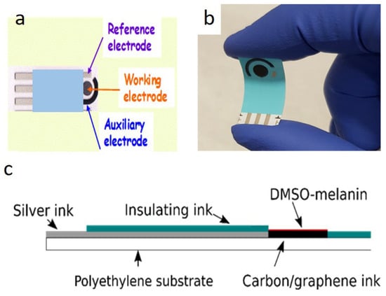 Printable and flexible graphene-melanin pH sensor. Top view (a), photograph demonstrating the flexibility of the sensor (b), cross section (c). Reproduced with permission [77]. Copyright 2020, IOP Science.
