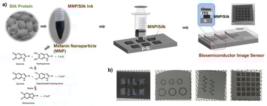 MNP-silk hydrogel/Si optical sensors. (a) Device fabrication process: 3D-printing of an array on Si followed by its attachment to indium tin oxide (ITO)/glass; (b) Photographs of printed structures of melanin NP-silk hydrogel on silicon. Reproduced with permission [21]. Copyright 2023, Elsevier.