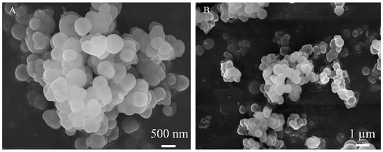 mSiO2 nanoparticles constitute a vital component of luminescent probes. Their microstructures were characterized using SEM at various magnification levels. The mSiO2 nanoparticles exhibit a spherical morphology (Figure 5A,B). Corresponding EDS mapping images (Figure S1A,B) reveal that these nanoparticles are primarily composed of two elements, silicon and oxygen, with a relatively uniform elemental distribution.
