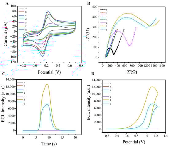 (A) CV curves in the 0.1 M KCl containing 5 mM [Fe(CN)6]3− solution and (B) EIS curves in the 10 mM [Fe(CN)6]3−/4− (1:1) containing 0.1 M KCl: (a) bare GCE, (b) 1N-GY/GCE, (c) Au/1N-GY/GCE, (d) cDNA/Au/1N-GY/GCE, (e) BSA/cDNA/Au/1N-GY/GCE, (f) mSiO2@Nafion@Ru(bpy)32+-Apt DNA/BSA/cDNA/Au/1N-GY/GCE, (g) KAN/mSiO2@Nafion@Ru(bpy)32+-Apt DNA/BSA/cDNA/Au/1N-GY/GCE. (C) The ECL-time and ECL-potential (D) curves of: (a) bare GCE, (b) 1N-GY/GCE, (c) Au/1N-GY/GCE, (d) cDNA/Au/1N-GY/GCE, (e) BSA/cDNA/Au/1N-GY/GCE, (f) mSiO2@Nafion@Ru(bpy)32+-Apt DNA/BSA/cDNA/Au/1N-GY/GCE, (g) KAN/mSiO2@Nafion@ Ru(bpy)32+-Apt DNA/BSA/cDNA/Au/1N-GY/GCE in 0.75 mM TPrA (pH 7.4).