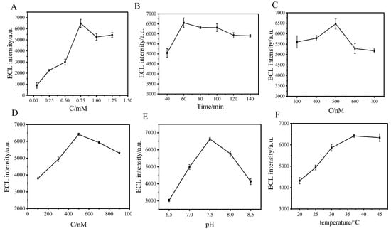 Parameter optimization of proposed ECL sensor using 1N-GY: (A) TPrA concentration; (B) incubation time; (C) aptamer concentration; (D) cDNA concentration; (E) reaction solution pH; (F) incubation temperature for cDNA and mSiO2@Nafion@Ru(bpy)32+-Apt DNA.