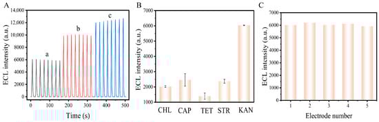 (A) Stability of ECL biosensors based on 1N-GY. ECL biosensors were prepared under optimal conditions and incubated with different concentrations of KAN: (a) 10−6 M, (b) 10−10 M, and (c) 0 M; (B) Specificity of ECL biosensors. Under optimal conditions, biosensors were prepared and incubated with different antibiotics at a concentration of 10−6 M: CHL, CAP, TET, STR, and KAN; (C) Repeatability of ECL biosensors. Five ECL biosensors were incubated with KAN at a concentration of 10−6 M under optimal conditions.
