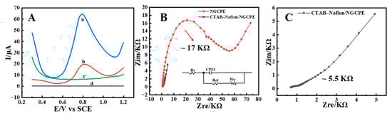 Both cyclic voltammetry (CV) and square wave voltammetry (SWV) are the commonly used techniques in the field of electrochemicals. In comparison, higher sensitivity screening can be obtained by SWV due to the minimal contribution of nonfaradaic currents [33]. Therefore, in the present research, SWV was used to evaluate the electrocatalytic capability of CTAB–Nafion/NGCPEs to AFB1 in 0.1 M PBS (pH = 5). From the results shown in Figure 3A, it could be observed that, in the absence of AFB1, almost no electrochemical response was observed on both bare NGCPE (curve d) and CTAB–Nafion/NGCPE (curve c). In the presence of 5 nM AFB1, a good electrochemical reduction peak with Ep = 0.812 V and Ip = 13.52 μA appeared on bare NGCPE (curve b), and a better response with Ep = 0.792 V and Ip = 45.88 μA was obtained on CTAB–Nafion/NGCPE (curve a). The higher sensitivity of the modified electrode indicated that the CTAB–Nafion composite has effective catalytical ability to stimulate the electrochemical response of AFB1, which may be due to the synergistic effect of CTAB and Nafion. Aflatoxin B1 and Nafion have strong hydrophobicity and are difficult to dissolve in water. In the structure of CTAB, there is a hydrophobic hexadecyl chain and a hydrophilic ammonium ion. The hydrophobic interaction between AFB1 and the hexadecyl chain of CTAB together with Nafion may play essential roles in the enrichment of AFB1 on the sensing interface [34].