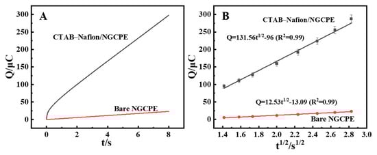Chronocoulometry (CC) was employed to compare the enrichment quantity of AFB1 on the surface of bare NGCPE and CTAB–Nafion/NGCPE (Figure 6A). Further investigation confirmed that the CTAB–Nafion/NGCPE facilitates greater accumulation of AFB1 compared to the bare NGCPE, as evidenced by the results presented in Figure 6B. The charge (Q) associated with the electrode reaction exhibited a proportional relationship with the square root of time (t1/2). This observation aligns with the Cottrell equation, which describes the relationship between the amount of adsorbed substance (Q) and the square root of the reaction time (t1/2) as follows [38]: