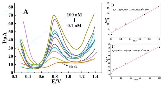 SWV was used to evaluate the linear range and detection limit of the sensor. From Figure 7A, it could be observed that the peak current of AFB1 increased with its concentration. As shown in Figure 7B, from 0.1 nM to 1 nM, the linear equation is Ip = (1.62 ± 0.85) + (24.9 ± 1.51)c, R2 = 0.99, with a detection limit of 20 pM (S/N = 3) and a sensitivity of (24.9 ± 1.51) μA/nM. As shown in Figure 7C, from 1 nM to 100 nM, the linear equation is Ip = (28.58 ± 1.01) + (0.33 ± 0.02)c, R2 = 0.99, with a sensitivity of (0.33 ± 0.02) μA/nM.