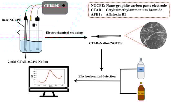 In this work, a nano-graphite carbon paste electrode (NGCPE) was homemade and modified with a CTAB–Nafion composite membrane through a simple electrochemical scanning method. The fabricated CTAB–Nafion/NGCPE shows an obvious catalytic effect on the electrochemical response of aflatoxin B1. The CTAB–Nafion/NGCPE was characterized with the aid of different techniques, such as scanning electron microscopy, energy-dispersive spectroscopy, Raman spectroscopy, electrochemical impedance spectroscopy, etc. The electrochemical experimental results demonstrated that the CTAB–Nafion/NGCPE has good sensitivity and selectivity, a short response time and good reproducibility, and could be applied successfully in the determination of aflatoxin B1 from milk and soy sauce. The schematic diagram of the preparation processes of CTAB–Nafion/NGCPE and its application is shown in Scheme 1.
