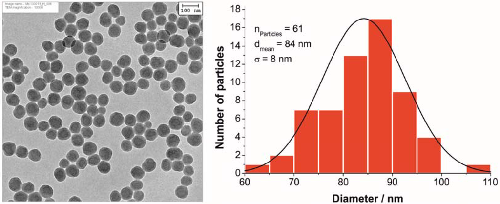 TEM and DLS were used to determine the diameter of the polystyrene nanoparticles. As expected, the hydrodynamic radius (determined by DLS) is larger than the physical radius (determined by TEM), as the high surface charge causes an extended hydration shell, which makes the particle appear larger in light scattering experiments. The mean diameter as calculated by evaluating 61 particles in the TEM image is 84 ± 8 nm (Figure 2), while DLS measurements showed a hydrodynamic diameter of 92 nm with a polydispersity index of 0.14. A zeta potential of −51.6 mV was calculated from the electrophoretic mobility data and proves the expected highly negative surface charge due to the presence of sulfonate groups in the polymer.