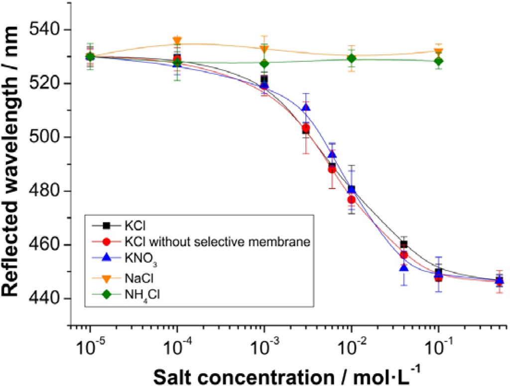 In order to quantify the potassium sensing properties of this novel combination of materials, the device was immersed into aqueous solutions containing different salts in varying concentrations, but at a constant pH value (Figure 3). Ammonium chloride, potassium chloride, potassium nitrate and sodium chloride were tested in concentrations between 10 µM and 0.5 M. In order to determine the sensitivity of the photonic crystal film alone, KCl solutions were also applied to a PAM film without valinomycin/PVC membrane coverage. The presence of K+ ions induces a color change at K+ concentrations between 0.1 mM and 0.1 M. The response is virtually instantaneous (<10 s), and the effects are fully reversible without the need for adding any other reagents. In comparison to an ionic strength sensor without PVC film [26], response times are marginally longer (~2–5 s), due to the ion-selective membrane coverage. The logarithmic plot is linear in the concentration range between 1 and 50 mM, and the slope is 53 nm per one log order of [K+]. This obviously also covers the typical concentration of K+ in serum (~4 mM). In addition, the sensor is very selective in that monovalent cations of approximately the same size (ammonium and sodium) do not cause a signal change over the whole concentration range (Figure 3). This also confirms that the PVC membrane prevents the direct contact of the analyte with the PhC film. The corresponding anion appears not to have an effect, since KCl and KNO3 give the same response.