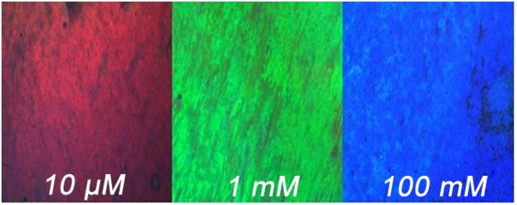The good correlation between the color of the sensor film and the concentration of K+ prompted us to study whether such films may be read out (“imaged”) using a digital camera mounted on a microscope. This method has been proven to be a viable, rapid and convenient approach to quantify the changes in color or fluorescence as they occur in sensor films designed to detect and image, for example, salinity [26], oxygen and pH values in vivo [32] or air pressure and temperature [33]. Others have used smart phones that can serve the same purpose ([34] and the references cited therein). The pictures of our new sensor films exposed to various concentration of K+ were acquired with a digital camera and a microscope and are shown in Figure 4.