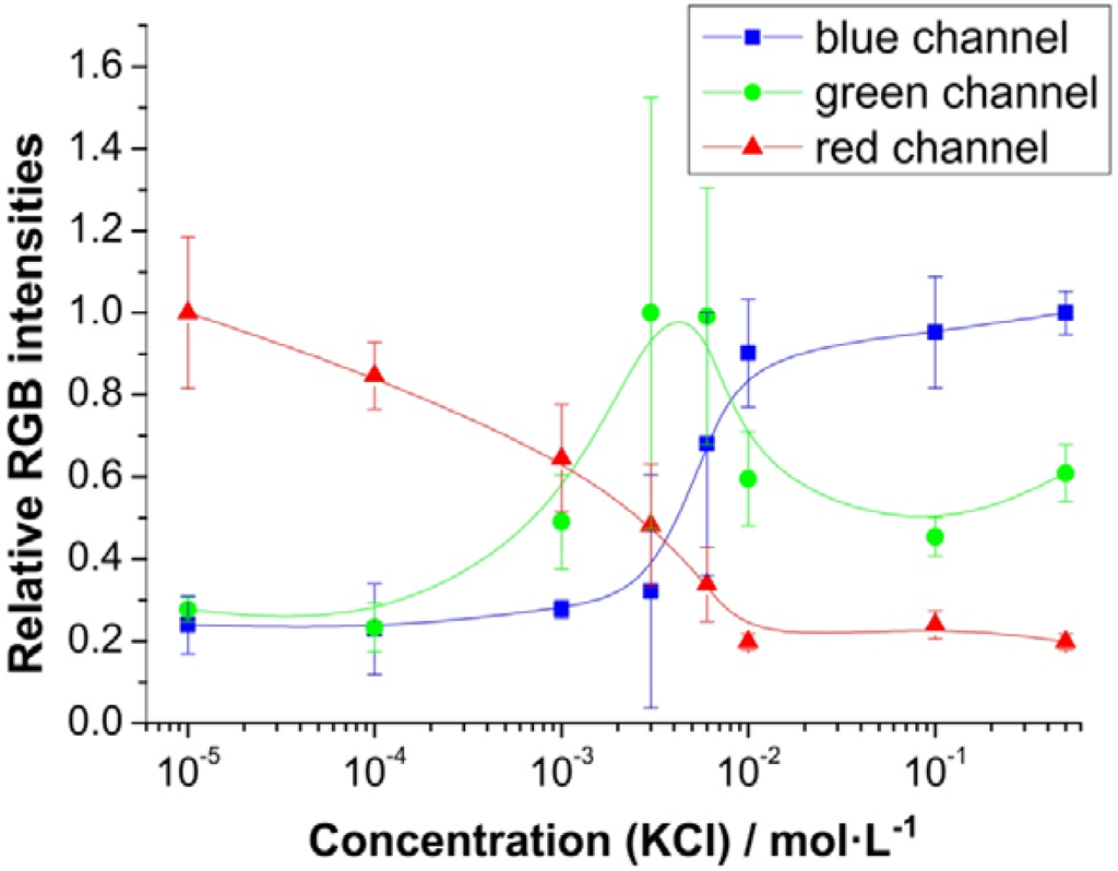 The RGB data sets of the digital pictures were then separated into the three-color channels (red, green and blue; RGB) of which any digital picture is composed. Subsequent mathematical processing allows analytical evaluation of the potassium ion content of aqueous solutions (Figure 5). The normalized values were obtained from the absolute individual RGB intensity by division through the maximum value of the average intensity of the respective channel (Irel = I/Imax(av)). The standard deviations of the blue and the green channel obviously are too high to allow for a precise calculation of [K+], but an evaluation of the red channel reveals an almost linear decrease (by 80%) in intensity on going from 10 µM to 10 mM potassium concentrations. Although the errors seem very high in general, these standard deviations symbolize the batch variation from sensor to sensor, with these resulting from measurements with five different films prepared by the same protocol. The errors obtained from a single film used for consecutive measurements are negligibly small. Then, the blue channel can also be used for content analysis, as its intensity rises 62% when the concentration of potassium ions increases from 1 to 10 µM.