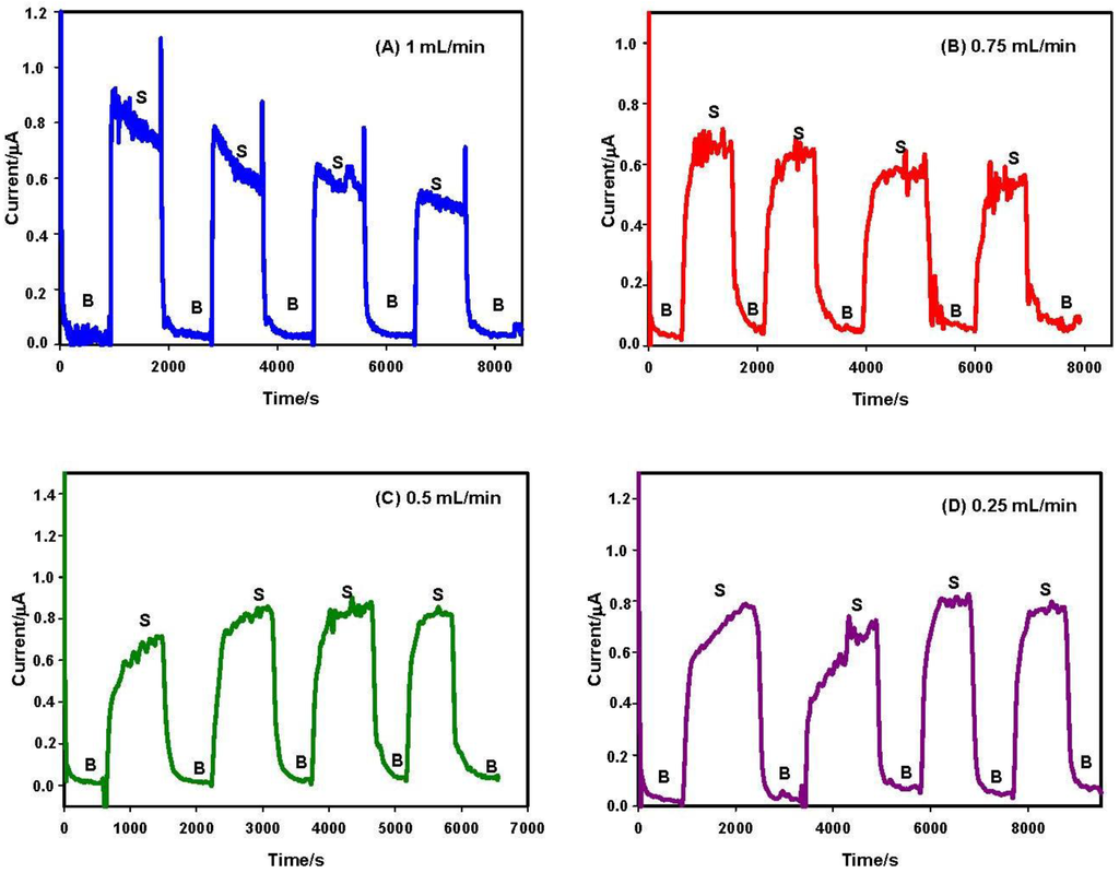 Preliminary studies were conducted to determine the optimal flow rate of the system, by using a flow rate ranging from 1 mL/min to 0.25 mL/min, in order to obtain the optimal sensitivity and repeatability of the measurements. In the amperograms reported in Figure 3, flow rates of 1 mL/min, 0.75 mL/min, 0.5 mL/min and 0.25 mL/min were investigated. Results indicated that the current signals decrease significantly during time when relatively high values of flow rates were employed (1 mL/min and 0.75 mL/min). Moreover, a better signal/noise ratio was observed with a flow rate of 0.25 mL/min.
