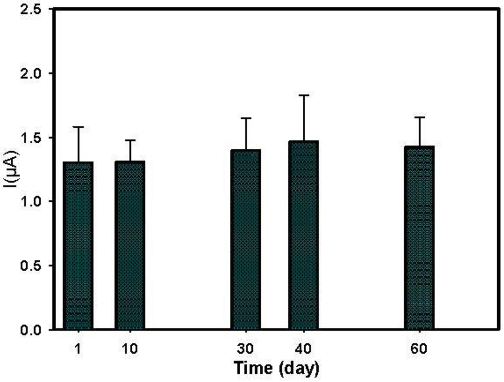 The stability in non-operational conditions (storage stability) was also investigated, since, together with repeatability, undoubtedly it represents a key aspect to consider a biosensor as commercially attractive. The storage stability was evaluated up to 60 days in flow system using 5 mM butyrylthiocholine solution (Figure 9). The biosensor, stored in the dark and at room temperature, gave responses almost constantly after eight weeks of investigation, confirming the robustness of the immobilization procedure.
