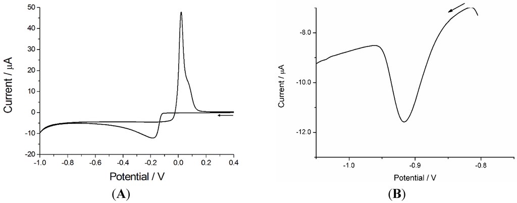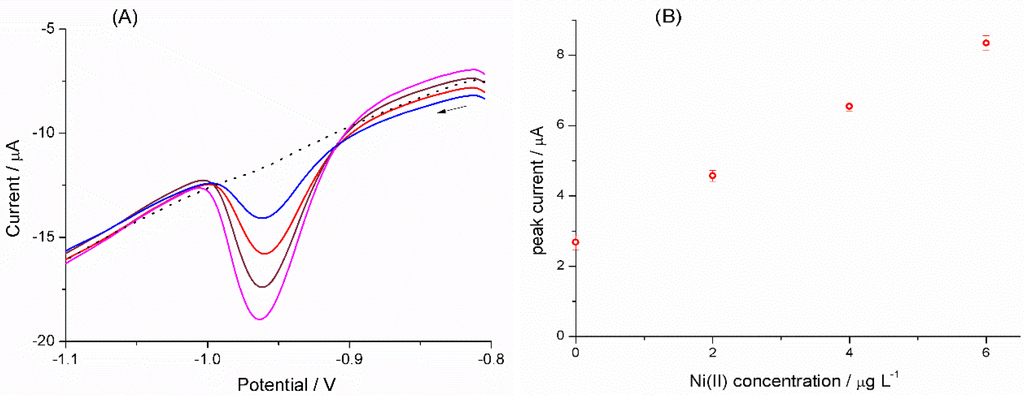 (A) Cyclic voltammogram recorded at a pyrolyzed photoresist electrode (PPCE) in 1 mmol∙L−1 Bi(NO3)3, 0.1 mol∙L−1 acetate buffer (pH 4.5) solution. Scan rate 10 mV s−1. (B) Typical adsorptive stripping voltammetry (AdCSV) of Ni(II) at an in situ prepared Bi-PPCE in 5 µg∙L−1 Ni(II) in 0.1 M ammonia buffer solution containing 10 mg∙L−1 Bi(III), 1 × 10−5 mol∙L−1 DMG and 0.01 mol∙L−1 tartrate. Deposition at −1.1 V for 60 s followed by accumulation at −0.8 V for 120 s; equilibration time of 15 s. Square wave parameters: frequency 25 Hz, potential step 5 mV, amplitude 50 mV.