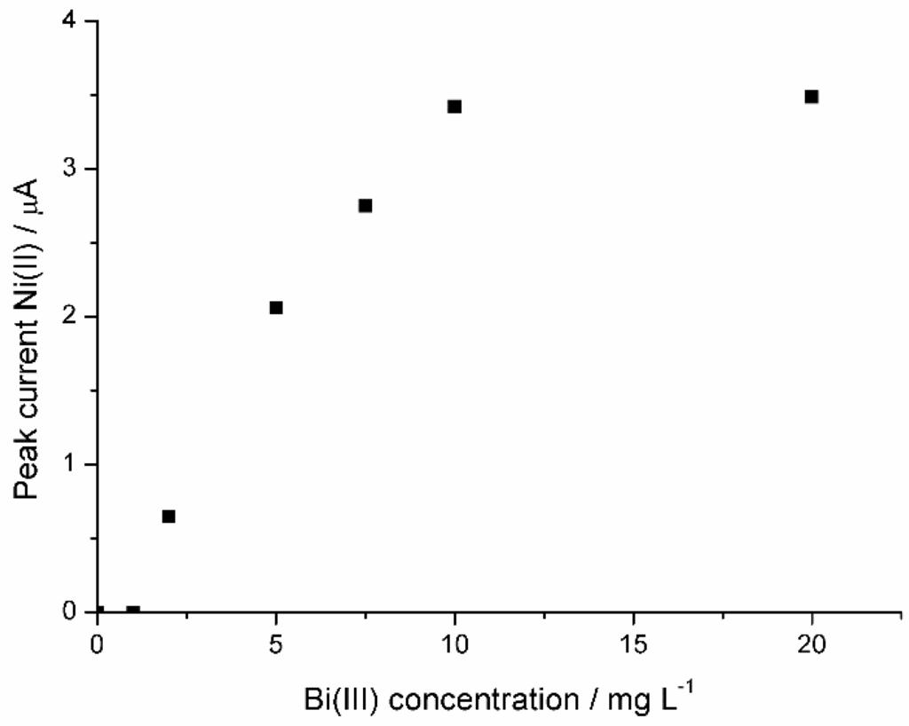 Effect of Bi(III) concentration on the Ni(II) peak current. Concentration of Ni(II): 10 µg∙L−1; accumulation conditions: 60 s at −0.8 V. Other experimental conditions as in Figure 1.