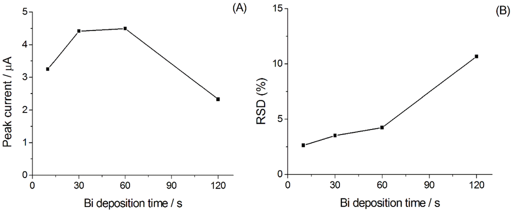 (A) Effect of Bi(III) deposition time on the Ni(II) peak current; (B) effect of Bi(III) deposition time on the Ni(II) peak relative standard deviation (RSD). Concentration of Ni(II): 10 µg∙L−1, accumulation time at −0.8V 60 s. Other experimental conditions as in Figure 1.