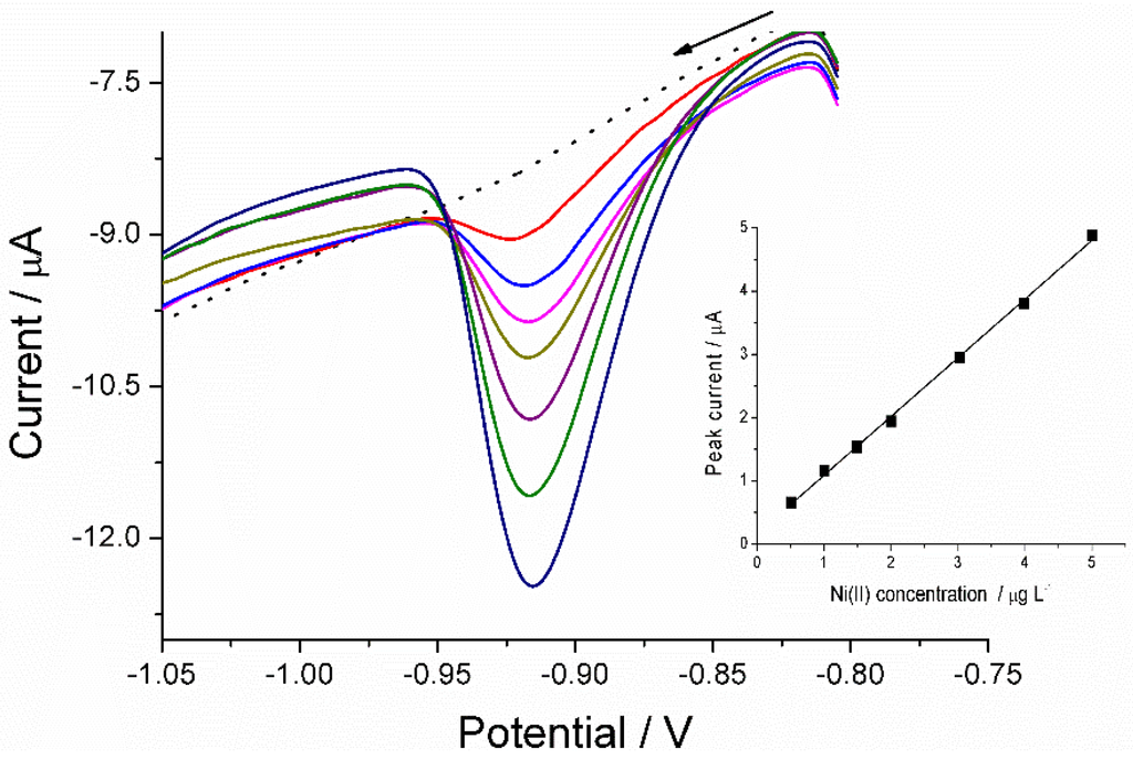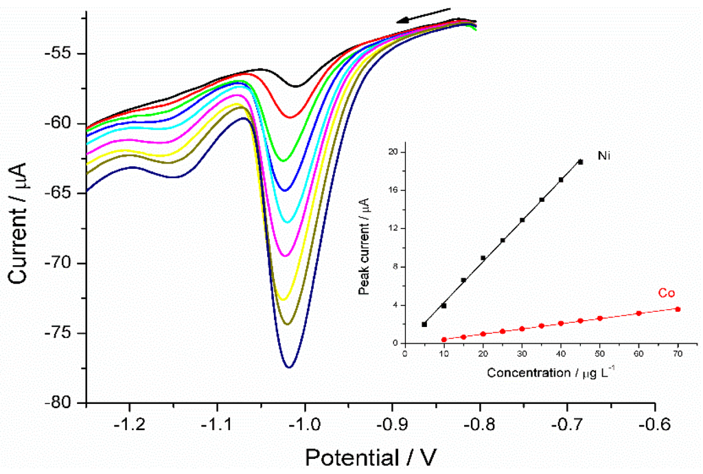 In particular, for nickel analysis, several electrochemical methods are proposed in the literature [24,28,29]. The majority of these studies were performed using the ex situ prepared bismuth film electrode and dimethylglyoxime (DMG) as the complexing agent [30,31,32]. Alves et al. proposed a solid bismuth vibrating electrode for the determination of Ni(II) and Co(II) [33]. Recently, the use of an in situ prepared bismuth film electrode (BiFE) [29,34] and an antimony film electrode (SbFE) [35] for measuring Ni(II) and Co(II) ions was proposed, with the advantage of providing a simplified, faster and, yet, sensitive and reliable procedure together with a fresh electrode surface for each consecutive measurement.