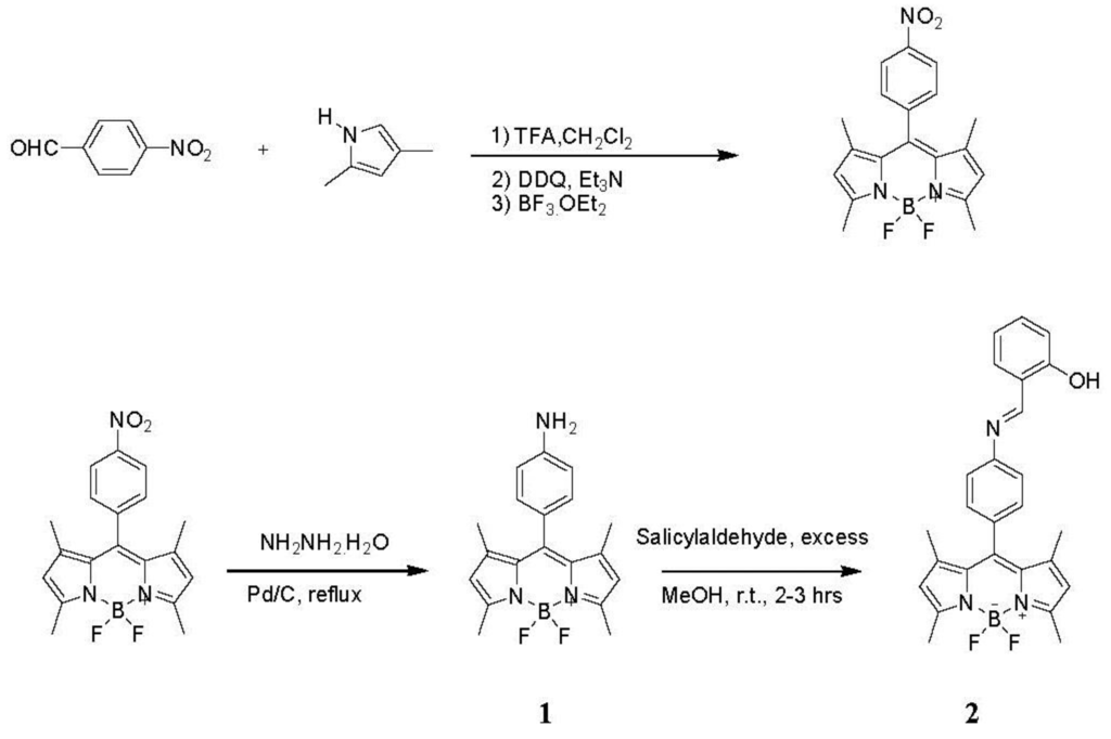 The synthetic routes that were used for the preparation of sensors 1 and 3 and the model compounds 2 and 4 are shown in Scheme 1 and Scheme 2. Nitro-BDP was synthesized from 2,4-dimethylpyrrole and p-nitrobenzaldehyde in one-pot reaction according to Imohori et al. [20] Reduction of nitro-compound was performed by refluxing hydrazine hydrate with Pd/C for 30 min, which cleanly gave a very good yield of amino-BDP product 1. Combining salicylaldehyde with compound 1 in methanol at room temperature produced the BDP-imine product 2 (Scheme 1).
