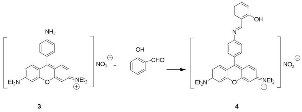 The rosamine sensor was synthesized according to Clunas et al. [21] (Scheme 2), with modifications noted in the experimental section. The intermediate product of nitrorosamine compound was synthesized by heating two equivalents of m-diethylaminophenol with one equivalent of 4-nitrobenzaldehyde. After purification with flash column chromatography, the rosamine chromophore was created in a single pot. Sulfuric acid was added to water and mixed with compound. The reaction mixture was then heated to 70 °C under nitrogen for 20 h and then at 90 °C for 29 h. Finally, nitric acid salt of the final crude nitro-substituted product was obtained in a very good yield and was isolated via filtration rather than column chromatography. Reduction of nitrorosamine was achieved by refluxing the intermediate with hydrazine hydrate and Pd/C in ethanol for 30 min. Compound 3 was isolated without any further purification, so the procedure is very easy to handle and amenable to scale up. Compound 4 was prepared in the same manner as compound 2.