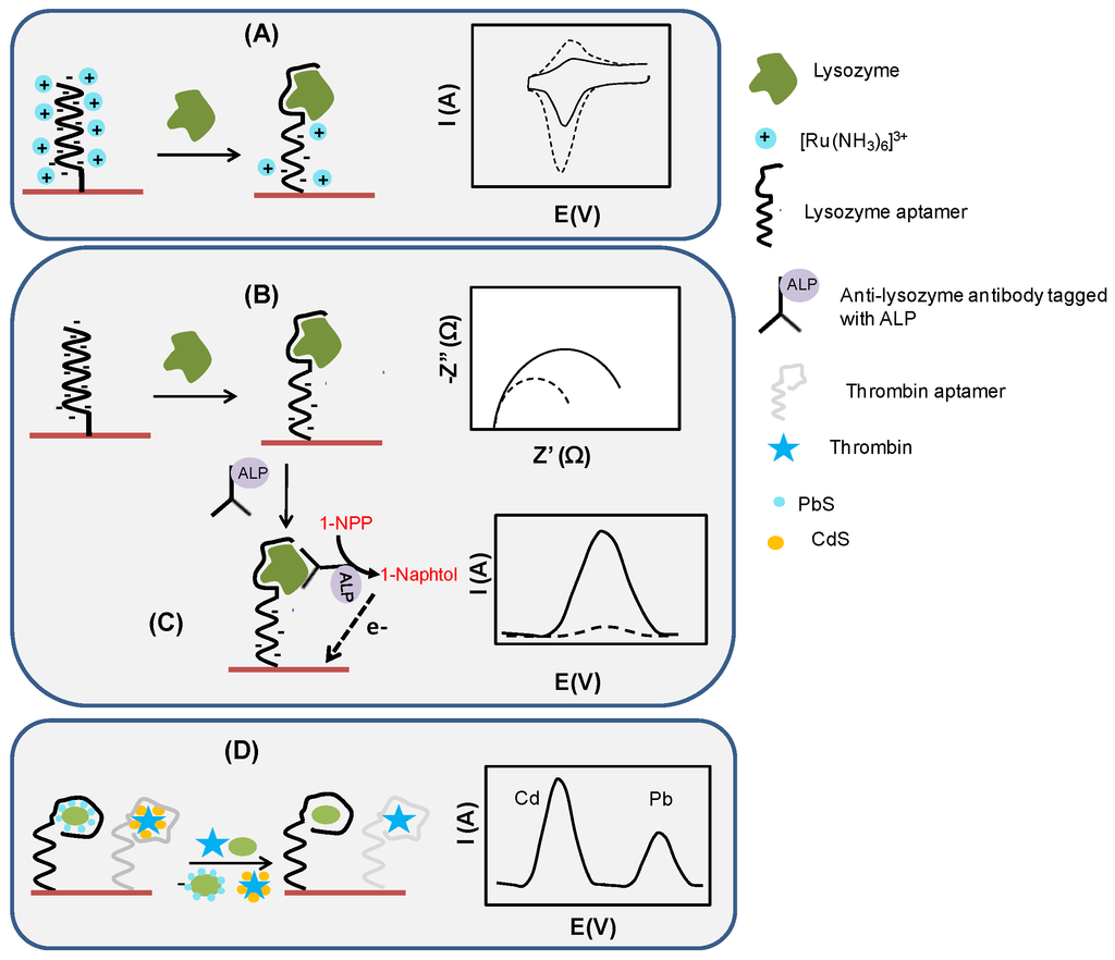 Electrochemical aptasensors’ detection schemes of lysozyme: (A) direct assay by recording the conformational changes of surface-linked aptamers upon lysozyme binding, which results in a decrease in electrostatically-bound Ru(NH3)6]3+ detectable by CV (e.g., as illustrated in [87]); (B) formation of the aptamer-lysozyme complex creates a barrier for the electron transfer of (Fe(CN)6]4−/3− in solution proportional to lysozyme concentration and detectable by EIS [63]; (C) sandwich assay for lysozyme analysis using amplification with a lysozyme antibody labeled with alkaline phosphatase [44]; (D) competitive assay where free lysozyme in solution displaces quantum dot-tagged lysozyme, previously bound to surface-immobilized aptamer (e.g., as illustrated in [94]).