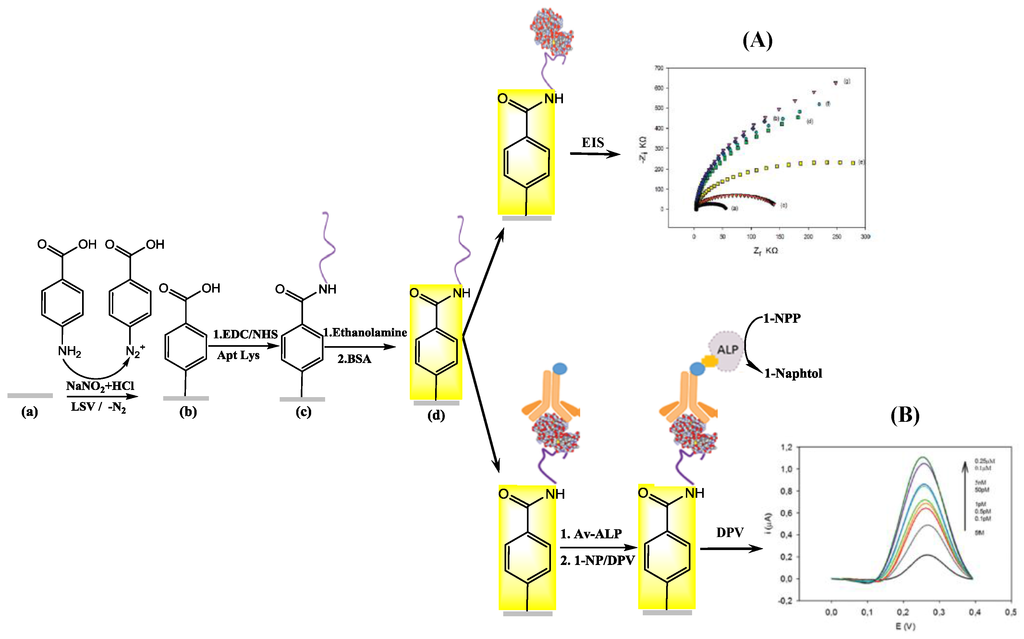 (A) Surface modification scheme and Nyquist plots for bare electrode (a), modified with diazonium salt (b), after EDC/NHS (c), functionalization with aptamer (d), after ethanolamine/BSA blocking (e) and after interaction with lysozyme (f) using PBS solutions containing [Fe(CN)6]4−/3− (2 mM) [63]; (B) surface modification and DPV signal after incubation with anti-lysozyme antibody and avidin-ALP coupling via biotin-avidin affinity for lysozyme sensing (reprint with permission from [44]).