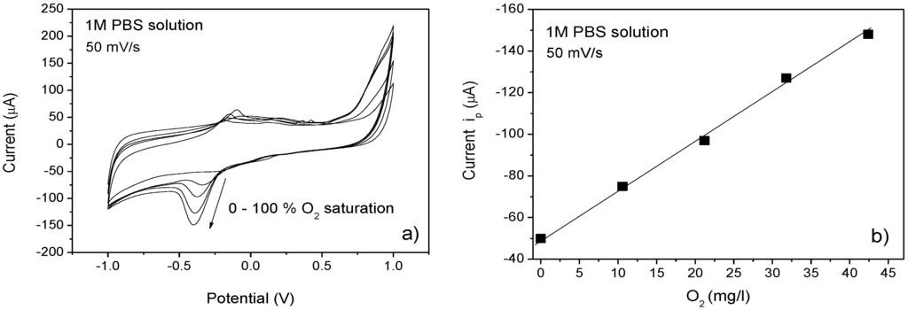 (a) Cyclic voltammograms obtained in presence of different oxygen concentration and recorded in the potential range from −1 to 1 V at a scan rate of 50 mV/s; (b) current-oxygen concentration behavior, obtained from cathodic peak at −0.4 V.
