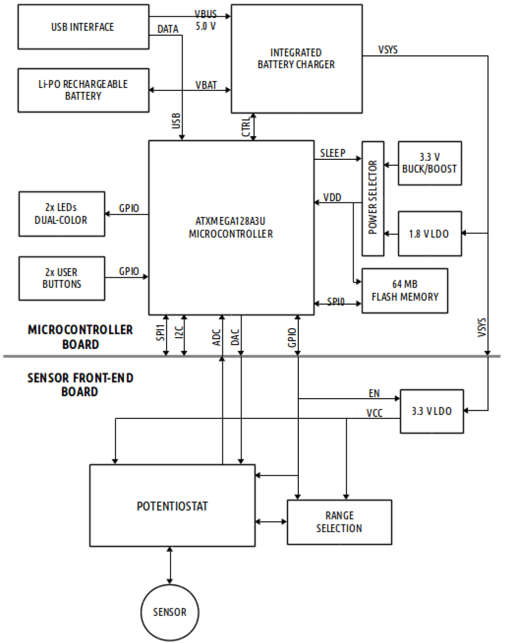 A portable analyzer for electrochemical sensors has been also designed and developed. The developed analog front-end allows the interfacing with electrochemical sensors, providing a wide bias range spanning from −1.0 V to +1.0 V with a resolution of about 1 mV and a current sensing range going from 10 nA to 8 mA, with five range options that can be selected by the CPU firmware. The block diagram of the electronic system is shown in Figure 3.