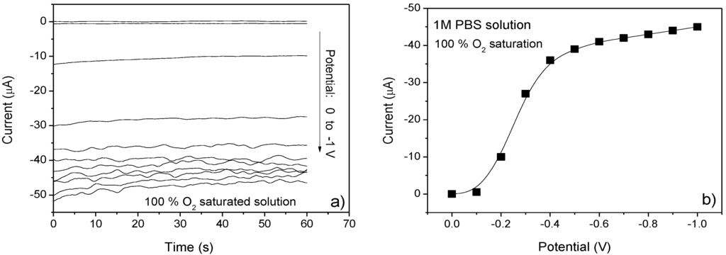 Amperometric measurements were performed in stirring solution during continues bubbling of O2/N2 gas mixture inside. First, we investigate the effect of applied potential at the working electrode of the sensor. In Figure 5a, the chrono-amperometric responses of the sensor obtained in O2 saturated solution at different applied potentials ranging from −0.1 V to −1 V are shown. The reduction process of oxygen occurs for potentials higher than −0.2 V and reaches a limit current at about −0.4 V (Figure 5b). Increasing the potential over this value has not produced a remarkable increase of reduction current. With above consideration, the constant potential of −0.4 V was chosen as the optimal detection potential for the amperometric tests.