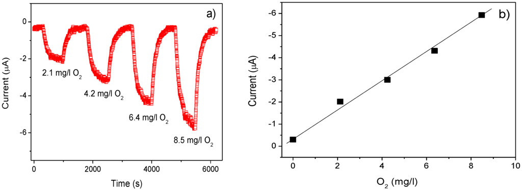 (a) Chrono-amperometric test obtained at an applied potential of −0.4 V during cycling saturation and purging of solution by oxygen at different partial pressure between 5% and 20%; (b) calibration curve of the sensor for different DO concentrations.
