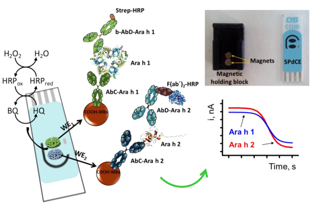 Schematic display of the fundamentals involved in the dual determination of Ara h 1 and Ara h 2 using screen-printed dual carbon electrodes (SPdCEs) as well as in the reactions implied in the amperometric responses. A real picture of the SPdCE and the homemade magnetic holding block is also shown.
