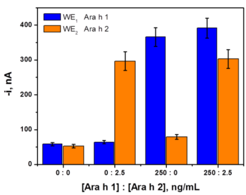 It is also important to note that the achieved LODs are better than those claimed with commercial ELISA kits for the individual detection of Ara h 1 and Ara h 2 (31.5 and 2 ng/mL, respectively) using the same immunoreagents employed in the dual immunosensor.