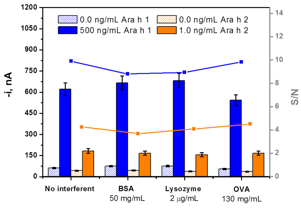 Current values measured for 0 and 500 ng/mL Ara h 1 and 0 and 1.0 ng/mL Ara h 2 in the absence or in the presence of 50 mg/mL bovine serum albumin (BSA), 2 μg/mL lysozyme and 130 mg/mL ovalbumin (OVA). Supporting electrolyte, 0.05 M sodium phosphate solution, pH 6.0; Eapp = −0.20 V vs. Ag pseudo-reference electrode. Error bars estimated as triple of the standard deviation (n = 3).
