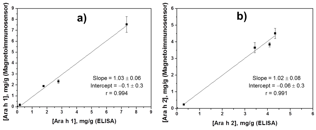 Correlation plots between the results obtained in the determination of Ara h 1 (a) and Ara h 2 (b) in food extracts using the developed dual immunoplatform and those provided by the individual ELISA spectrophotometric kits (data from Table 2).