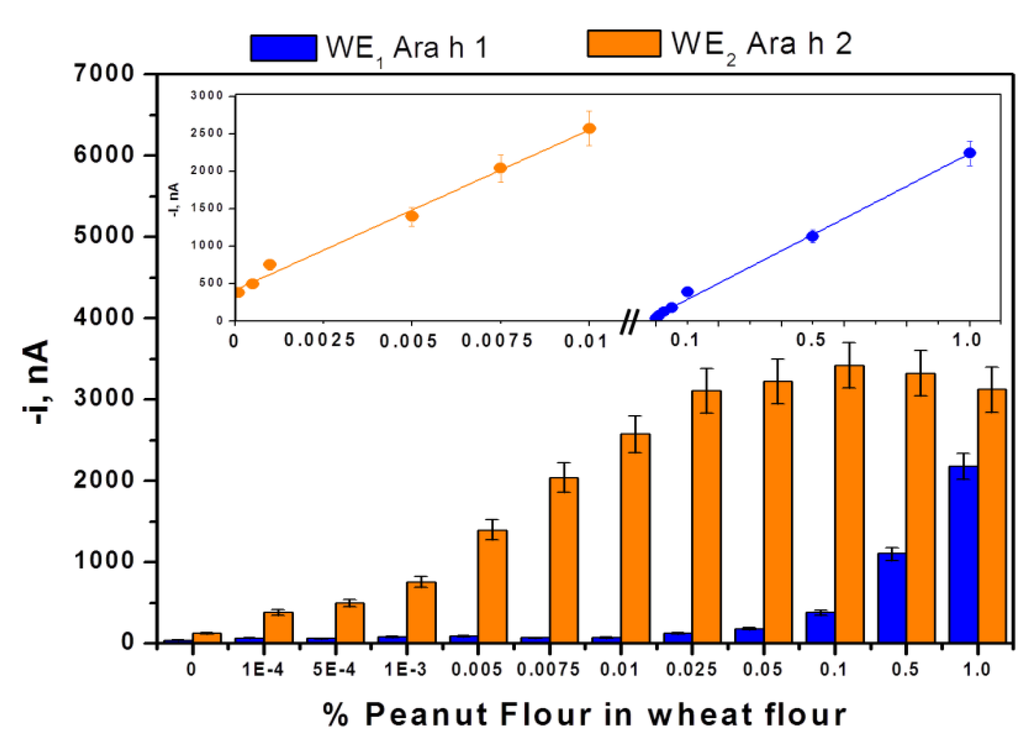 Determination of the endogenous content of allergenic proteins Ara h 1 and Ara h 2 in different food extracts with the amperometric dual immunosensor and comparison with the results provided by ELISA spectrophotometric kits.