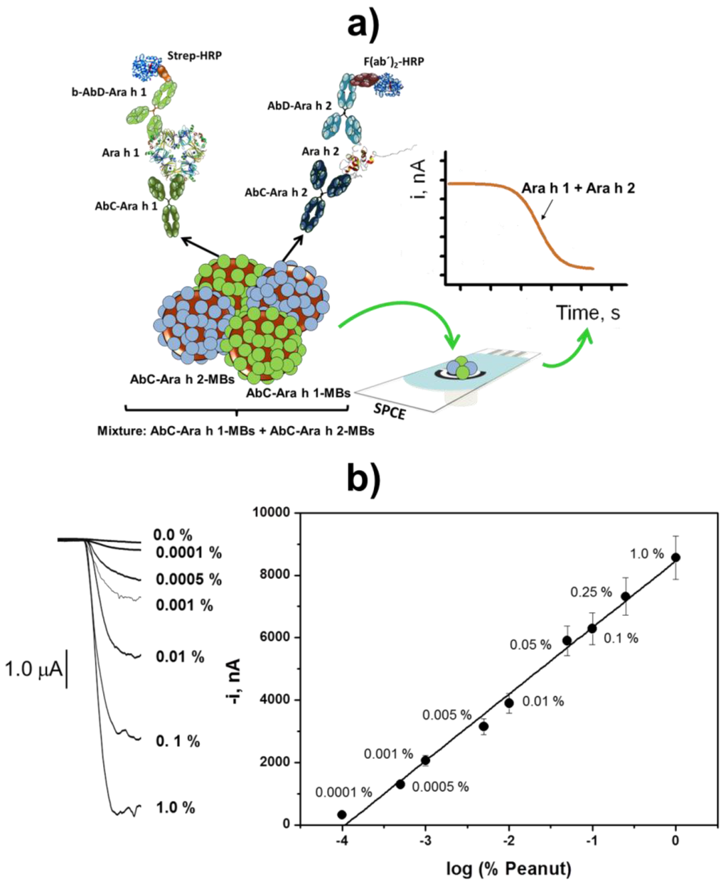 Figure 7a shows a schematic display of the approach. The modified MBs are commingled together and incubated sequentially in the sample and mixture of the two AbD solutions as well as in the labeling reagents’ solutions and then captured on the surface of a SPCE. The results presented in Figure 7b demonstrate that this methodology allows a clear discrimination of samples contaminated with peanut over five orders of magnitude concentrations, between 0.0001% and 1.0%. Therefore, this approach, although not designed to identify the type of peanut allergenic protein detected, proves to be a user-friendly, attractive, effective and rapid tool (2 h) for detecting the presence in a wide concentration range or verifying the absence of peanuts in foods.