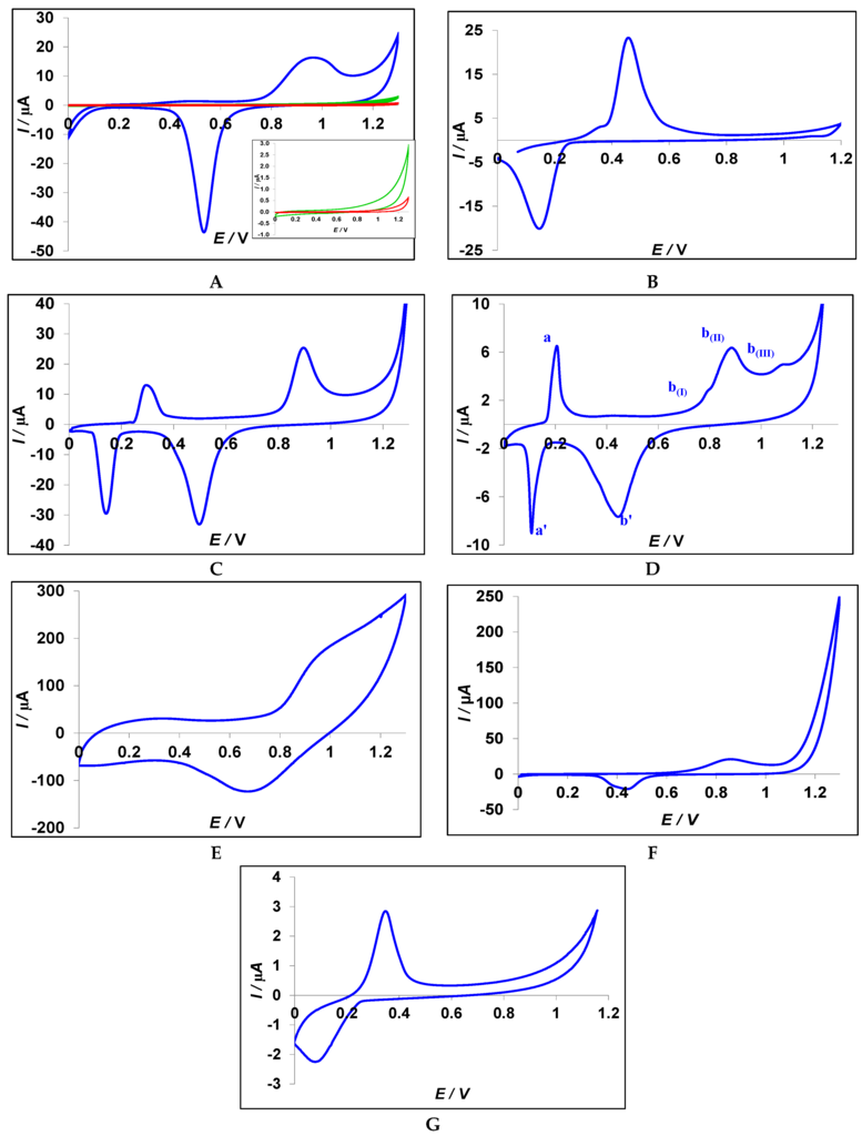 Cyclic voltammograms of modified CPE with different synthesized nanoparticles in PBS 0.1 M pH 7.0, scan rate 100 mV·s−1. In Figure 2A, both the CV of a bare CPE and Cys-CPE are plotted in red and green, respectively (inset: zoom of the curves). (A) Gold nanoparticles (Au); (B) silver nanoparticles (Ag); (C) silver–gold alloy (Ag/Au); (D) silver–gold core shell (Ag@Au); (E) gold–silver core shell (Au@Ag); (F) hollow gold nanospheres (HGN); (G) hollow silver nanospheres (HSN).