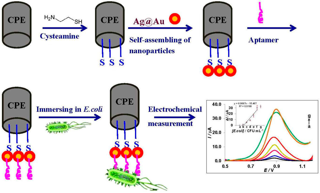 It is well known that the properties of detection systems composed of nano-dimensional elements are different from those of common bulky ones [1]. Among the various nanoparticles (NPs), noble metal nanomaterials such as Ag, Au, Pt, and Pd have attracted a lot of attention for their unique physical and chemical properties like tunable surface plasmonics, high-efficiency electrochemical sensing, enhanced fluorescence, and quantum conductance [2]. Of particular interest are binary metallic nanostructures showing multiple characteristics [3]. In this case, core/shell nanoparticle architectures, in which a layer of metal surrounds another NP core, have shown specific properties different from those of their monometallic counterparts and even alloys [4]. In this structure, the stability and surface chemistry of the shell nanoparticles can be improved along with accessing the physicochemical nature of the core layer. This synergy between two metals can be coordinated by shape, size, and composition. The core/shell nanostructures might exhibit favorable electrocatalytic activity, taking place on the shell of the NPs while the core metal dramatically affects the performance of the whole NPs [5]. Due to their particular electronic and catalytic impacts as well as their good stability, convenience of electron transfer, and biocompatibility [6], gold and silver are ideal choices for the construction of core/shell nanostructures in biosensors. Tang et al. reported a silver–gold core shell (Ag@Au) label-free amperometric immune biosensor [7]. Li et al. introduced a hydrogen peroxide sensor based on Au@Ag@C core-double shell nanocomposites [8]. Eksi et al. developed an electrochemical immunosensor for the determination of E. coli using Ag@Au bioconjugates and anti-E. coli modified PS-microwells [9]. Here we report, for the first time, on the effect of using Ag@Au core shell NPs for the electrochemical aptasensing of gram-negative bacterium E. coli.