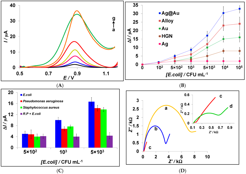 As observed in the inset of Figure 1B, the oxidation of the bacteria solution shows a representative signal around 0.80 V, using DPV at the surface of a bare CPE. Figure 4A shows the DPVs of the Ag@Au aptasensor in different concentrations of E. coli. There is an enhanced signal around 0.88 V when increasing the bacteria concentration from 0.0 to 105 CFU/mL. The oxidation signal of E. coli at the surface of a bare CPE could only be observed at concentrations higher than 5 × 105 CFU/mL (see Figure 1A). However, the bacteria oxidation process at bare CPE occurs at less positive potential in comparison to the aptamer-modified CPE. This small shift in the position of the potential can be attributed to the coverage of CPE. On the other hand, the oxidation of gold happens approximately at this potential (see Figure 2A,C,D). Therefore, we assume an overlap between these two oxidation signals, guanine oxidation in E. coli, and gold oxidation of the nanostructures, playing a synergetic effect in its detection. The stability of gold at the surface of the working electrode is confirmed by successive CV scanning, as shown in Figure 2.