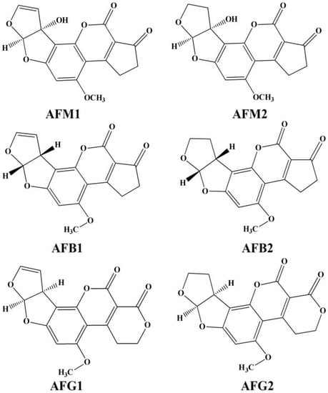 With the increasing incidence and stubbornly high mycotoxin mortality around the world, the earlier diagnosis of mycotoxin contamination has drawn significant attention. The presence of mycotoxin in food and feed due to their associated toxic effects on human health and the environment has now became a primary concern [1]. Mycotoxins are the toxic fungal metabolites produced by fungi (micromycetes and macromycetes) under specific conditions of temperature and moisture [2]. The optimal condition of temperature for mycotoxin—producing molds ranging between 24 °C and 35 °C and a relative humidity of ≥70%. Toxicity of these metabolites in human and warm-blooded animals is commonly known as mycotoxicosis. More than 300 mycotoxins (aflatoxins, ochratoxins, trichothecane) commonly exist, but only some of them are practically important. Among all, the most commonly studied groups of mycotoxins are aflatoxins (AFs). Initially, AFs were isolated and identified after the death of young turkeys on poultry farms in England, which were found to be related due to the consumption of a Brazilian peanut meal. AFs are the difuranocoumarin derivatives mainly produced by Aspergillus parasiticus, Aspergillus flavus, and rarely by Aspergillus nomius [3]. AFs are often present in corn, peanuts, nuts, almonds, milk, cheese, and wide varieties of agriculture foodstuffs and beverages [4,5]. They have been classified based on their fluorescent properties under ultraviolet light (365 nm) and chromatographic mobility into different structural analogs, such as B-group (cyclopentane ring, blue fluorescence), G-group (lactone ring, yellow-green fluorescence), and a metabolite of B-group known as AFM1 and AFM2 (Figure 1). Among AFs, AFB1 is the most common and highly toxic contaminant responsible for more than 75% of all AF contamination in food and animal feed [6]. Subsequent exposure of AFB-contaminated feed to lactating animals leads to secretion of AFM1 and M2 in milk through the hydroxylation reaction mechanism. AFM1 and AFM2 are quite stable during milk pasteurization, as well as dairy product processing, which may persist to the final stage during human consumption [7,8,9].