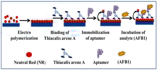 Castillo et al. reported the development of an electrochemical aptasensor using polyamidoamine PAMAM dendrimers for AFB1 detection [79]. For sensor fabrication, a single-stranded (ss) amino-modified DNA aptamer highly specific to AFB1 was immobilized on the assembly of a multilayer framework of immobilized PAMAM dendrimers on the gold electrode. The CV and EIS measurements were performed to capture the signal response by means of redox indicators: K[Fe(CN)6]3−/4−. The aptasensor allowed AFB1 determination in the range of 0.1–10 nM AFB1. The sensor possesses the LOD of 0.40 ± 0.03 nM, with a stability of 60 h at 4 °C. In previous years, the use of mediators, such as methylene blue, ferrocene, ferri-ferrocyanide, and methylene green in the electrochemical sensor has been successfully reported for a decrease in potential and amplification of signals [83,84,85,86]. Previously, an electrochemical aptasensor based on the electropolymerization of neutral red on the electrode surface for detection of AFB1 has been reported by Evtugyn et al. [80]. The aptasensor was prepared using covalent immobilization of anti-AFB1 DNA aptamer to the polycarboxylated macrocyclic ligand immobilized (Thiacalix arene A) on an electropolymerised layer of neutral red, which acts as a redox probe (Figure 2). For quantitative measurements of AFB1, CV and EIS measurements were carried out. The developed aptasensor showed a LOD of 0.05 nM with EIS in 4-(2-hydroxyethyl)-1-piperazineethanesulfonic acid (HEPES) binding buffer. It was reported that the developed protocol provides the enhancement in stability of the surface layer and improved reproducibility of the voltammetric signal in multiple food matrices, such as peanuts, cashew nuts, white wine, and soy sauce.