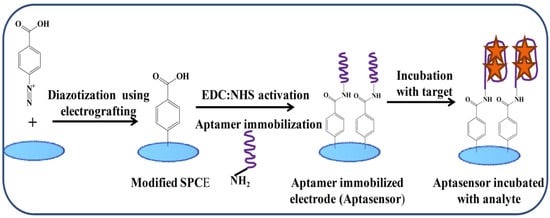 Schematic representation of an electrochemical aptasensor used for determination of AFB1 using diazotized SPCEs (scheme illustration from [81]).