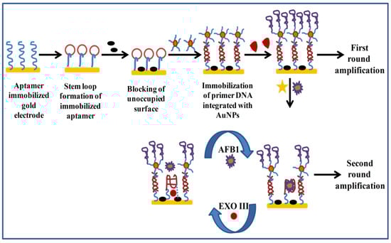 Very recently, a label-free EIS aptasensor for the detection of AFB1 in alcoholic beverages [81]. An EIS aptasensor was fabricated over SPCEs via immobilization of anti-AFB1 aptamer using a diazonium coupling mechanism (Figure 3). In this work, the two different sequences of an anti-AFB1 aptamer were used and compared for their analytical performance. On incubation of AFB1, a dynamic detection range from 0.125 to 16 ng/mL was obtained with a LOD of 0.12 and 0.25 ng/mL for seqA and seqB. The performance of the EIS aptasensor was successfully demonstrated in alcoholic beverages (beer and wine samples) with recoveries between 92% and 102%. The developed aptasensor offers the advantages of disposability and portability for on-site analysis. Among the reported electrochemical techniques, one important strategy is the designing of a switchable on-off electrochemical aptasensor, which results in a signal upon target recognition depending upon conformational changes. However, for the “signal-off” electrochemical sensor, it is generally recognized that the suppression of the signal alters the sensitivity and specificity of the developed platforms [87]. Presently, to effectively avoid the inherent drawbacks of signal-off biosensors, the integration of different amplification approaches became attractive, such as in vitro DNA amplification. Based on the above facts, an enzyme-based signal amplification electrochemical aptasensing platform for ultrasensitive detection of AFB1 has been reported by Zheng et al. [82]. In this work, a heteroenzyme-based two-round signal amplification electrochemical aptasensor approach was designed for AFB1 detection. In the first round, the telomerase-based amplification led to the generation of a high current signal, which increases the detection range (Figure 4), whereas in the second round the EXO III-based amplification led to the generation of an observable signal response corresponding to the trace concentrations of AFB1. Based on the advantage of the two-round signal amplification strategy, the sensitivity and detection range of proposed electrochemical aptasensors were greatly improved.