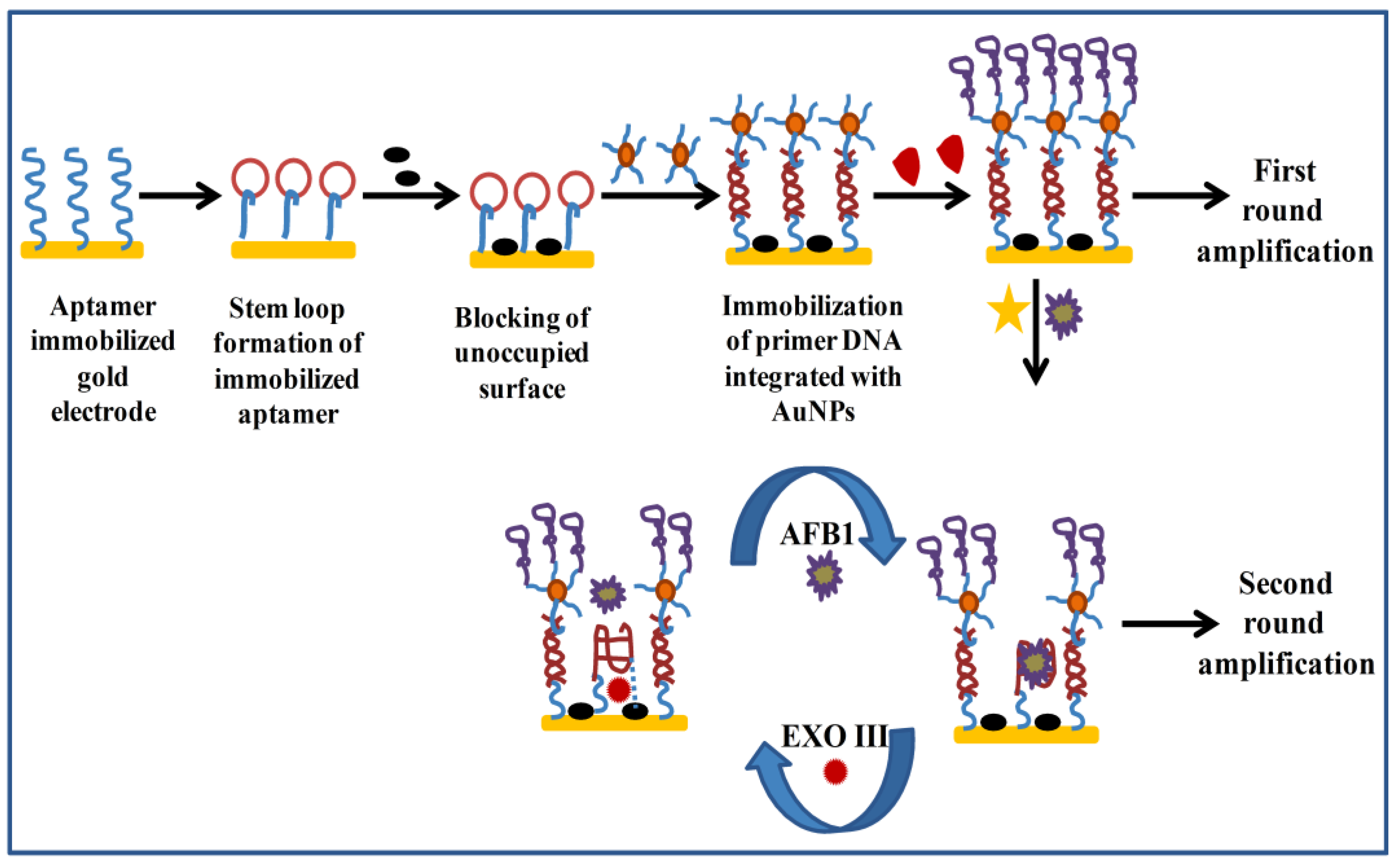 - Zheng, W.; Teng, J.; Cheng, L.; Ye, Y.; Pan, D.; Wu, J.; Xue, F.; Liu, G.; Chen, W. Hetero-enzyme-based two-round signal amplification strategy for trace detection of aflatoxin B1 using an electrochemical aptasensor. Biosens. Bioelectron. 2016, 80, 574–581. [Google Scholar] [CrossRef] [PubMed]