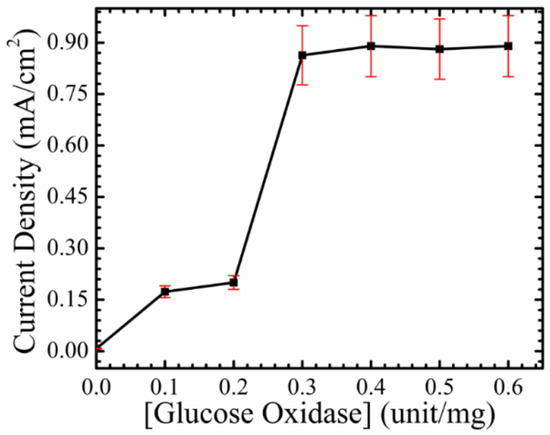 The current density as a function of glucose oxidase concentrations, in order to optimize the concentration of the enzyme GOx for the working electrode immobilization condition.