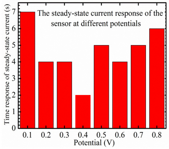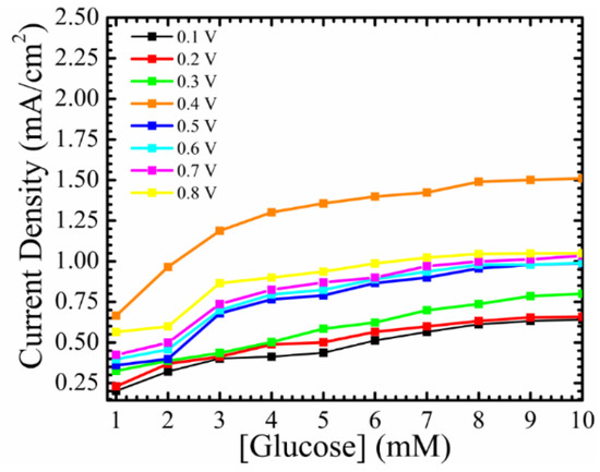 A platinum plate was used as a counter electrode and the device was tested in a range of voltages, 0.1–0.8 V. To optimize the applied potential, a steady-state current study is performed, in order to test the sensor’s response time changes in glucose concentrations. A range of applied potentials, 0.1–0.8 V, was utilized in the optimization study. The fastest and sharpest response was observed at 0.4 V, and the steady-state current and the saturation level were reached within 2 s with different glucose concentrations. The optimization condition is presented in Figure 4.
