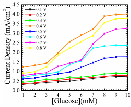 Current density of Si/SiO2/Au/ZnO NRs/GOx/Nafion as a function of different glucose concentrations at different applied potentials.