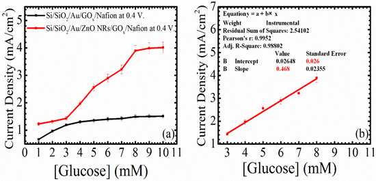 Figure 7a is the current density of the device and the baseline as a function of the glucose concentrations at 0.4 V. The fabricated working electrode showed constant changes in the current density when adding or changing glucose concentrations. After the applied potential passes the equilibrium potential between the working and the counter electrodes, H2O2 is produced as an electrochemical reaction product, and it is oxidized on the surface of the as-grown ZnO NRs, as shown in Equation (2). In Figure 7a, one can see slight changes in the current density, with increasing glucose concentrations on the surface of the working electrode without the growth of ZnO NRs. After the growth of ZnO NRs on the surface of the working electrode, the fabricated sensor exhibited clear changes in current density with the addition of glucose to the PBS. In addition, the glucose active range was extended from 3–8 mM, and this can be found in Figure 7b.