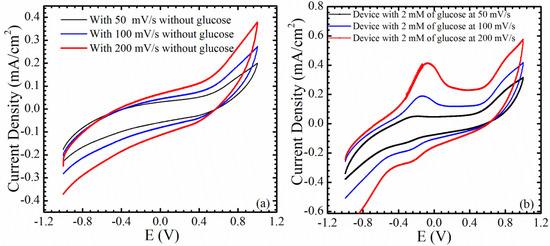Cyclic voltammetry of the fabricated Si/SiO2/Au/ZnO NRs/GOx/Nafion with and without glucose at different scanning rates, 50, 100, 200 mV/s. (a) Absence of glucose; (b) Presence of glucose.