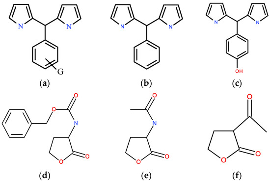 (a) General formula of 5-substituted dipyrromethanes; (b) 5-phenyl dipyrromethane; (c) 5-phenol dipyrromethane; (d) N-carbobenzoxy-L-homoserine Lactone (Cbz-HS) used as template; (e) acetyl-HS used as template; (f) α-acetyl-butyrolactone used as interferent.