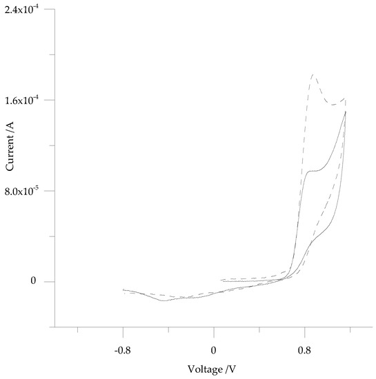 A Time-resolved Electrochemical Quartz Crystal Microbalance (EQCM) potentiostat/galvanostat CHI 400C (CH Instruments, Inc., Austin, TX, USA) working station was used to carry out the measurements. This potentiostat has access to electroanalytical or microgravimetric or combined electromicrogravimetric determinations when used either in EQCM or in QCM mode. The potentiostat interfaced with a computer with the CHI 16.03 software version control. The electrochemical measurements were performed using three electrodes in a one-compartment static Teflon cell, sealed with a Teflon cap to avoid solvent evaporation. The voltage was applied at the Pt-quartz crystal working electrode (WE), with respect to an Ag/Ag+ non-aqueous reference electrode (RE) and a Pt-wire auxiliary electrode (AE). All instrumentation, software, and accessories were from CH Instruments, Inc., Austin, TX, USA. In EQCM operative mode, the current variation (ip) in relation with the applied potential at the Pt-quartz WE was recorded. When needed, the ip was recorded together with the frequency shift (Δf in Hz) due to the mass variation at the quartz crystal surface. Δf due to the mass variation at the Pt-quartz crystal surface was recorded, instead, as a single signal in microgravimetric (QCM) mode. Quartz crystal microbalance (QCM) data were analyzed according to the Saurebrey equation [].